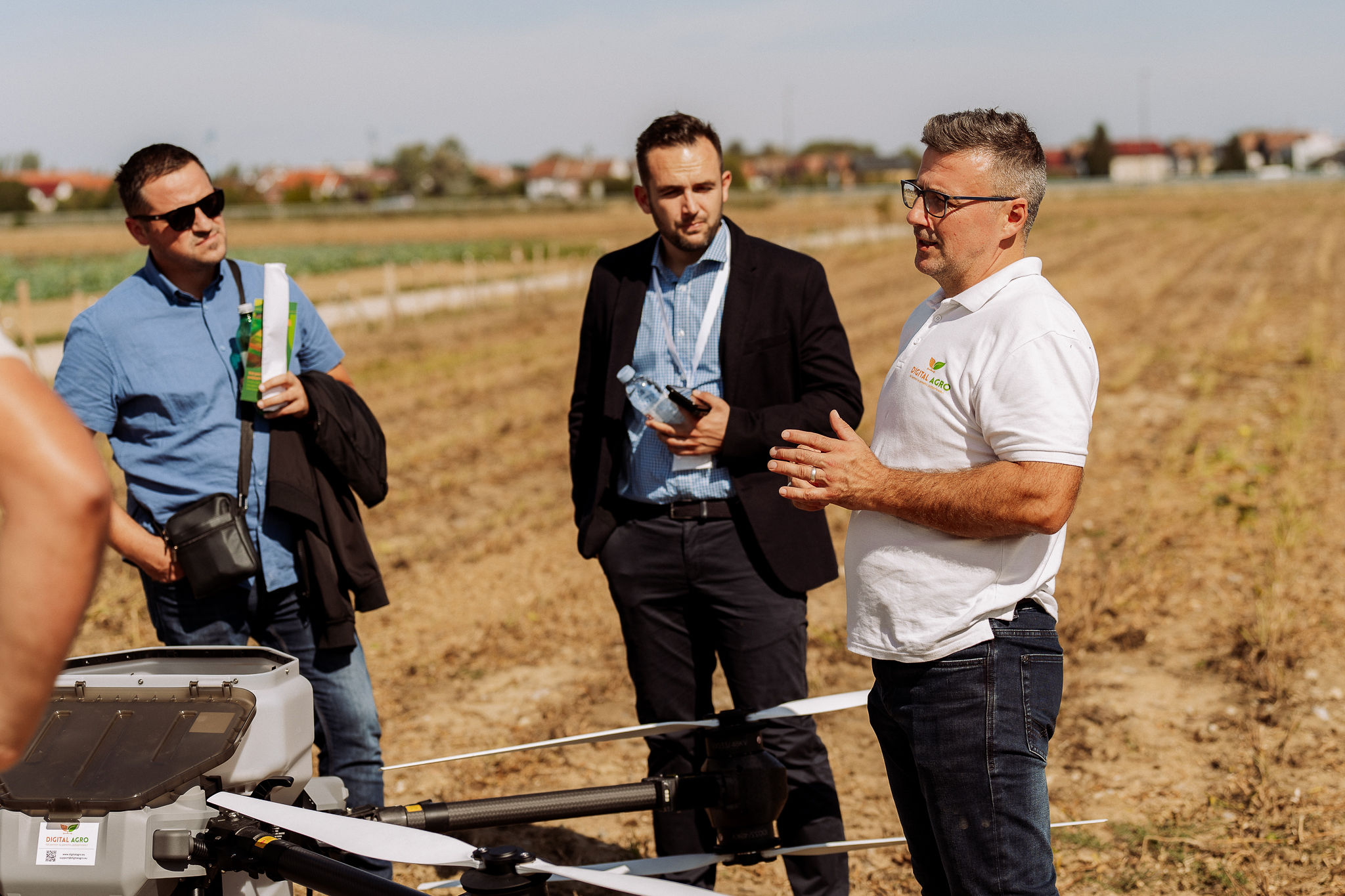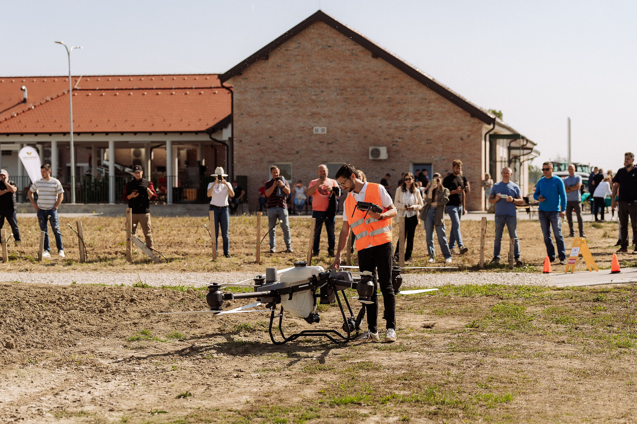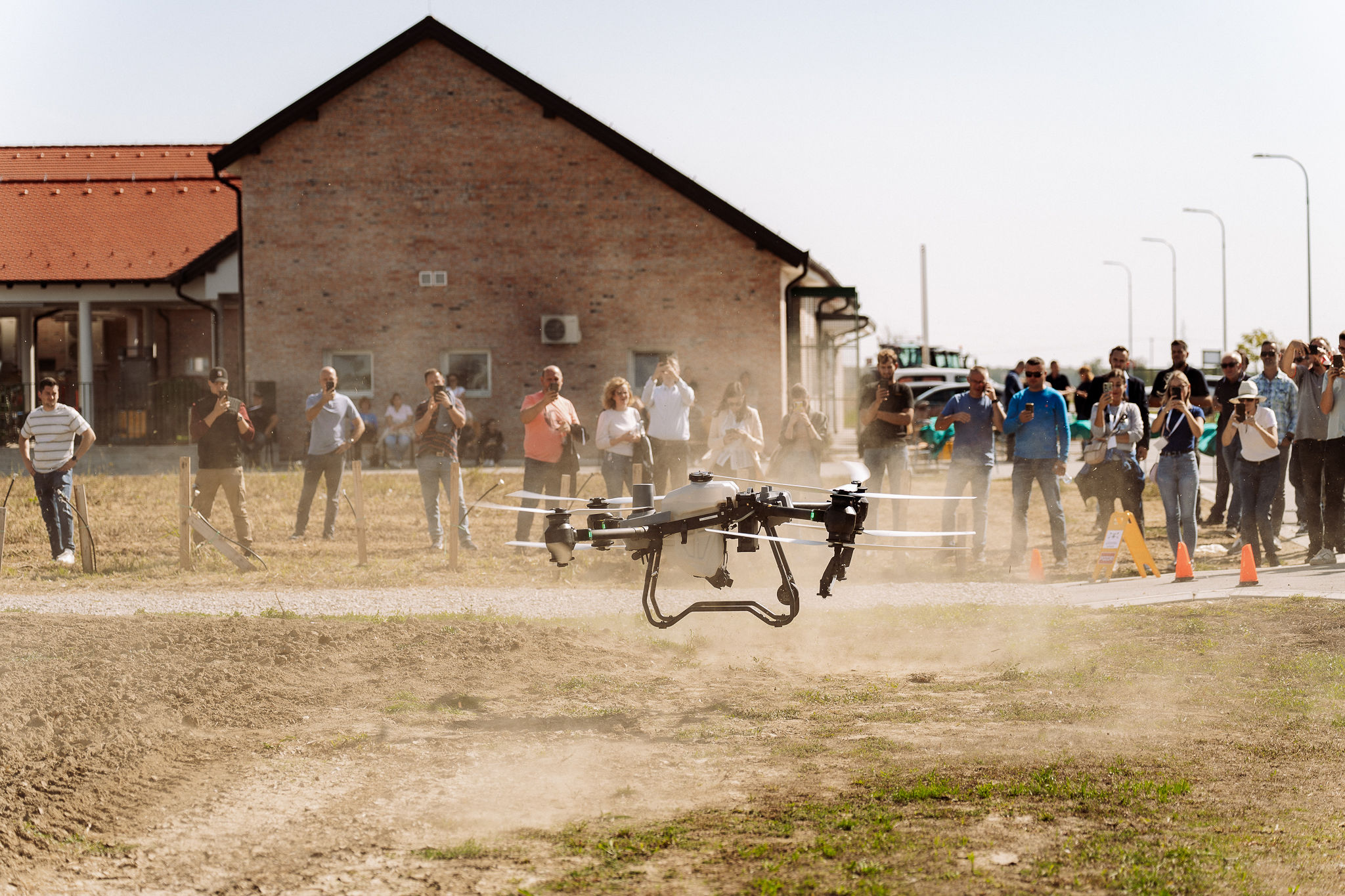 Nakon toga, prebacili smo se na vanjski dio polja gdje smo odradili špricanje kupusa vodom sa poljoprivrednim dronom DJI AGRAS T50, uz primjenu prethodno generirane VRA mape za preciznu primjenu škropiva. Na licu mjesta demonstrirali smo jednostavnost zamjene spremnika za tekućinu sa spremnikom za rasipanje, kojeg smo zamijenili unutar 3 minute, te u spremnik za rasipanje dodali smjesu leguminoza. Za kraj, demonstrirali smo rasipanje smjese leguminoze poljoprivrednim dronom i pokazali kako se i na taj način može upotrijebiti poljoprivredni dron.