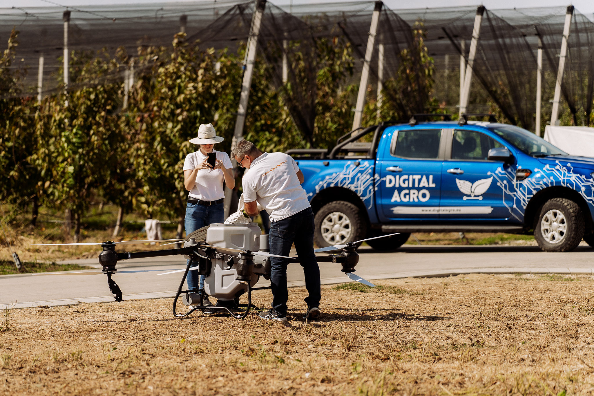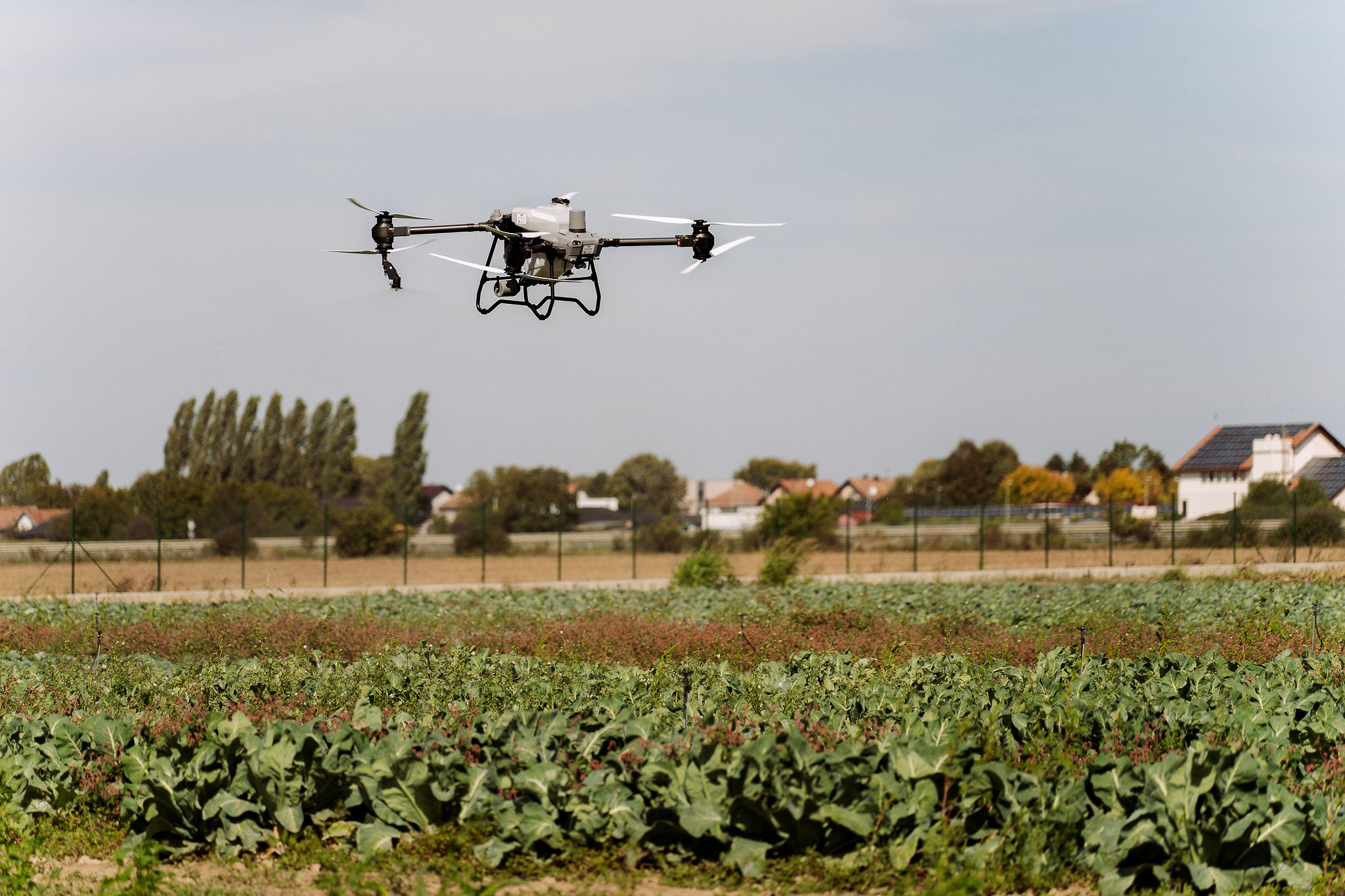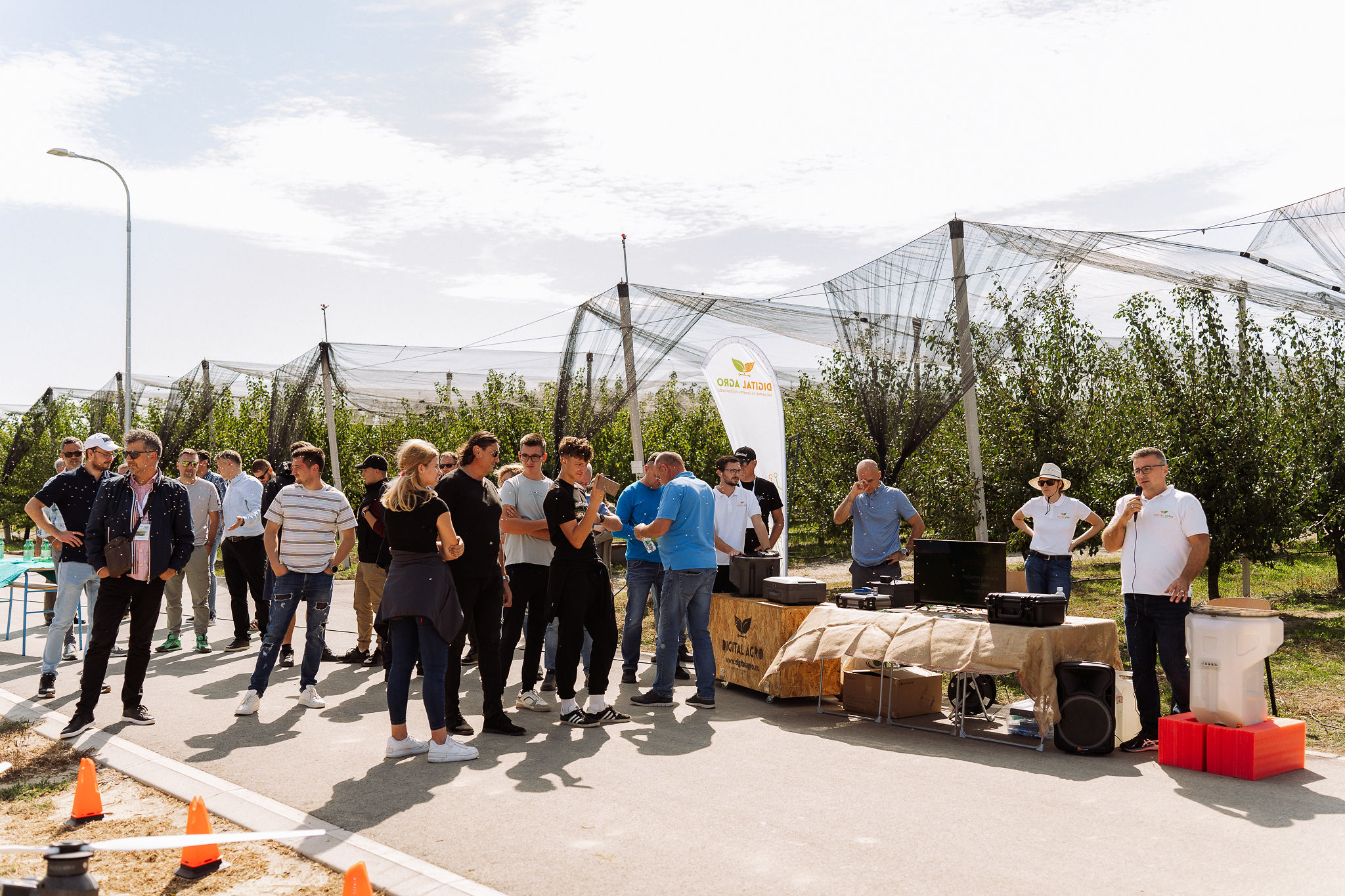 Nakon toga, prebacili smo se na vanjski dio polja gdje smo odradili špricanje kupusa vodom sa poljoprivrednim dronom DJI AGRAS T50, uz primjenu prethodno generirane VRA mape za preciznu primjenu škropiva. Na licu mjesta demonstrirali smo jednostavnost zamjene spremnika za tekućinu sa spremnikom za rasipanje, kojeg smo zamijenili unutar 3 minute, te u spremnik za rasipanje dodali smjesu leguminoza. Za kraj, demonstrirali smo rasipanje smjese leguminoze poljoprivrednim dronom i pokazali kako se i na taj način može upotrijebiti poljoprivredni dron.